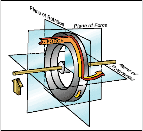 Precession is the tilting or turning of a gyro in response to a deflective force. The reaction to this force does not occur at the point where it was applied; rather, it occurs at a point that is 90° later in the direction of rotation.